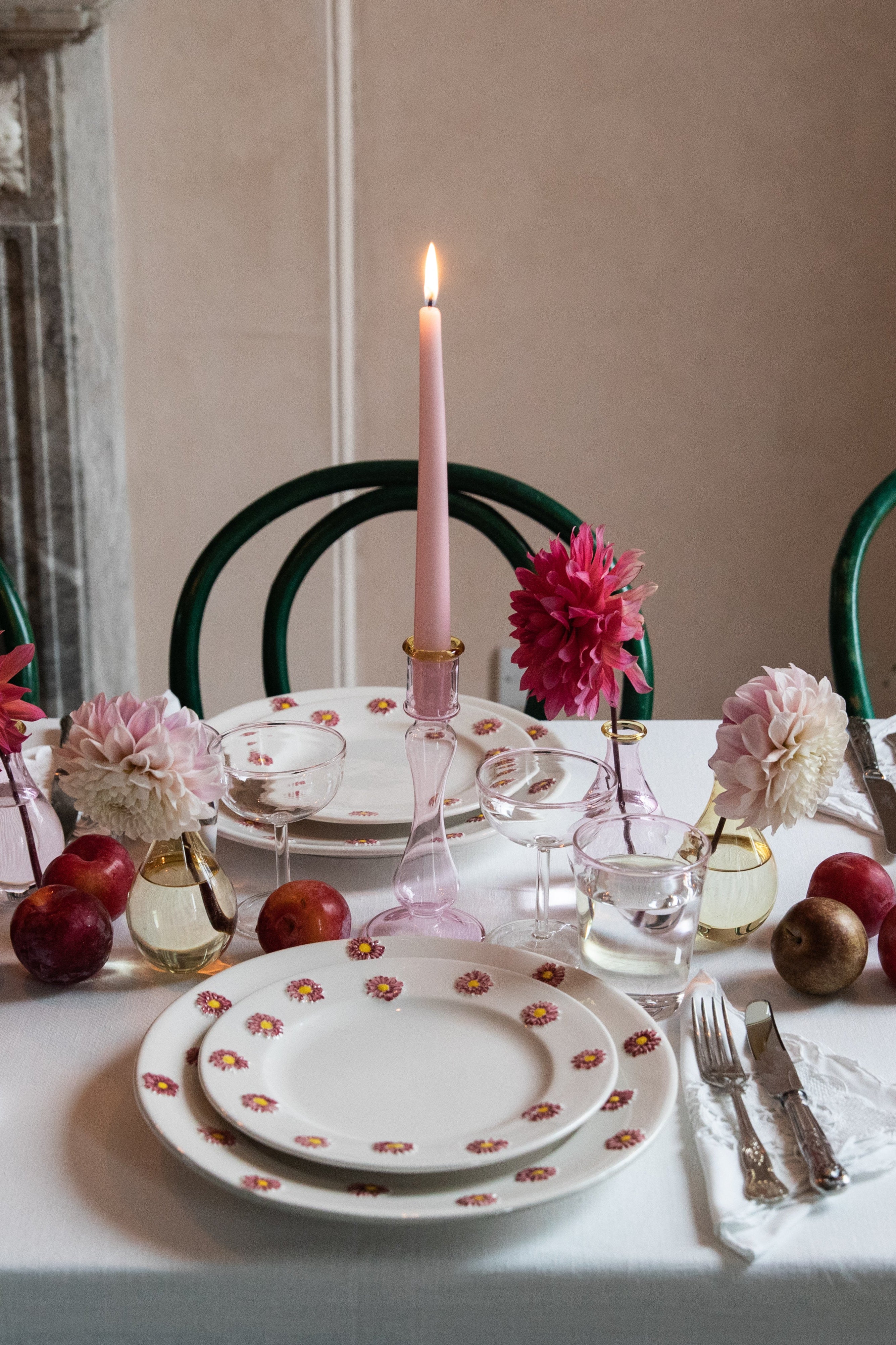 Set of 4 Dinner Plates / White ceramic with a hand-painted red poinsettias / Dishwasher safe recommended at a gentle setting / Avoid leaving in water for long periods of time / Designed and crafted in Italy / Includes a tips from Skye